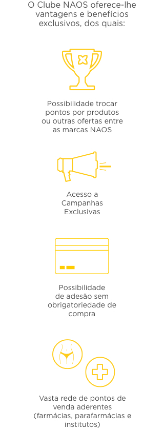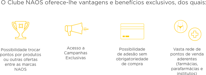 O Clube NAOS oferece-lhe várias vantagens: - As suas compras valem pontos que podem ser posteriormente usados para troca por produtos BIODERMA e ESTHEDERM, assim como troca por outras ofertas ou experiências disponíveis para rebate no clube. - Acesso a campanhas exclusivas para membros do clube NAOS. - Possibilidade de adesão ao clube, usufruindo de todas as suas vantagens mesmo sem efetuar uma primeira compra.
